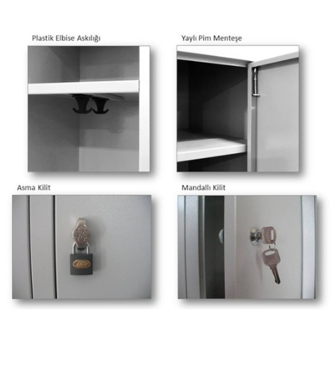 İkili soyunma dolabı 1. kalite 6112 DKP Sac üzerine paslanmaya karşı dayanıklı elektrostatik boyalıdır. İkili personel soyunma dolabı dolabın alt yüzeyinin zeminle temasını önlemek için dolabın altında dört köşesinde ayaklar bulunmaktadır. Metal İkili dolabın kapakların üzerinde hava giriş ve çıkışını sağlamak amacıyla panjur delikleri ve isimlik bulunmaktadır. Çelik tekli soyunma dolabın rafların altında kullanıcının kıyafetlerini asacağı askılıklar bulunmaktadır. İkili soyunma dolabın kilitleme sistemi asma kilitli olup, asma kilitler ürüne dahil değildir. Tüm madeni kısımlarda, parçalar tam göyesinde kaynatılır, alt ve üst kısımlar ile raflar birbirine paralel olacak şekilde punta kaynak yapılır